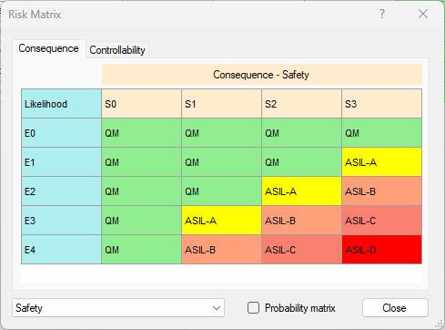 Risk matrix for safety-related assessment based on likelihood and consequence with ASIL classifications from QM to ASIL-D