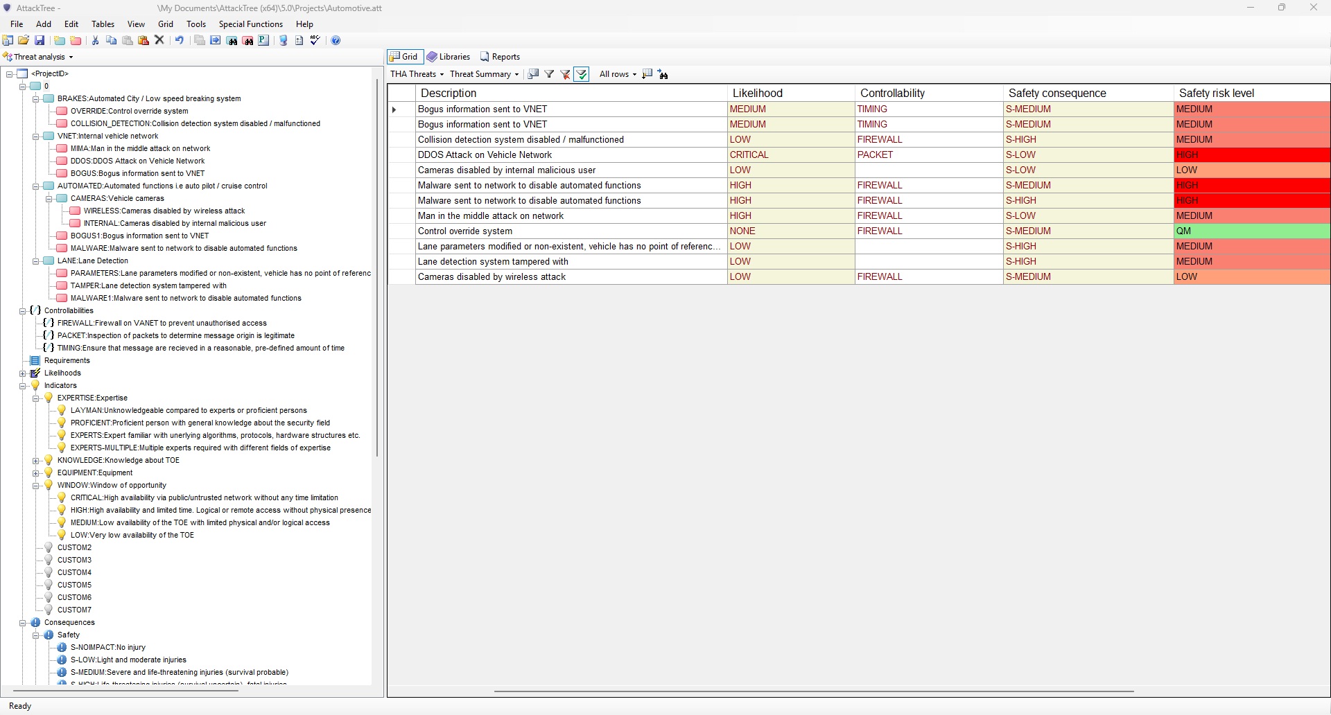 Software interface for safety risk analysis showing a table that evaluates threats by likelihood, controllability, safety consequence, and risk level